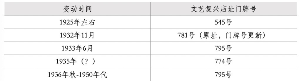 1933年6月,报社搬到了马路对面的774号。我有个推论,即文艺复兴很可能就是在这个时候搬到了795号。霞飞路东西走向,门牌号码无论新旧,始终是道路北侧为双数,南侧为单数。因此在霞飞路上自东向西行走的时候,文艺复兴一直是在街道左边,正符合1930年代的人对这家店位置的印象。不久之后,因为795号需要旧屋翻造和重新装修,文艺复兴一度搬到对面774号和《柴拉报》共用店址。直到1936年秋工程结束,文艺复兴搬回795号,从此直到解放后结束营业为止,没有再搬迁过。这大概就是大家公认文艺复兴的地址是795号的原因。1936年11月有则短文曾经简单回顾过文艺复兴的历史,提到它1925年开设,原本在金神父路(今瑞金二路)口,不久迁到对面《柴拉报》处,直到最近迁回。可以看出时人的印象大致还是对的,只是大大地简化了变迁的过程。这个过程可以简单地总结如下: