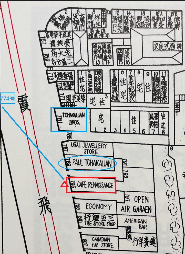 从二三十年代的店址变化不难看出,文艺复兴和老大昌(或者说Tchakalian家族),以及《上海柴拉报》之间的联系相当密切(可能还包括了曾经开在774号底楼的信济银行)。1932年底,文艺复兴经历过一次债务清理,不过对营业并没有造成什么影响。如果留心1930年代早期的报道和文章,会发现文艺复兴从来没有停止营业过,而且生意一直都很好。这次清理中提到公司所有人的名字中就有Pierre Tchakalian和Basile Pavlo,Pavlo家族也是1930年代中期以后文艺复兴的老板和经营者,看起来Tchkalian家族很可能是或曾经是文艺复兴的重要股东。