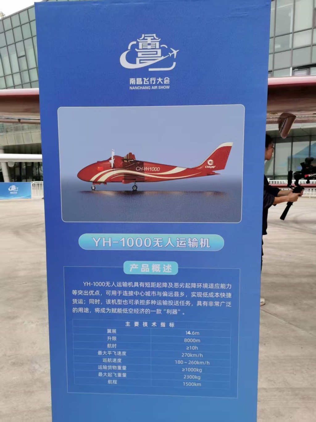 YH-1000作为运输机类型中冉冉上升的新星,优势突出,可短距起降,也可在草地、雪地、沙地等恶劣地面环境起降,可连接中心城市与偏远县乡,实现低成本快捷货运。同时,也可承担多种运输投送任务,是低空经济的新利器。根据展板介绍,该无人机航程1500公里,运输货物重量大于1吨,最大平飞速度270千米/小时。