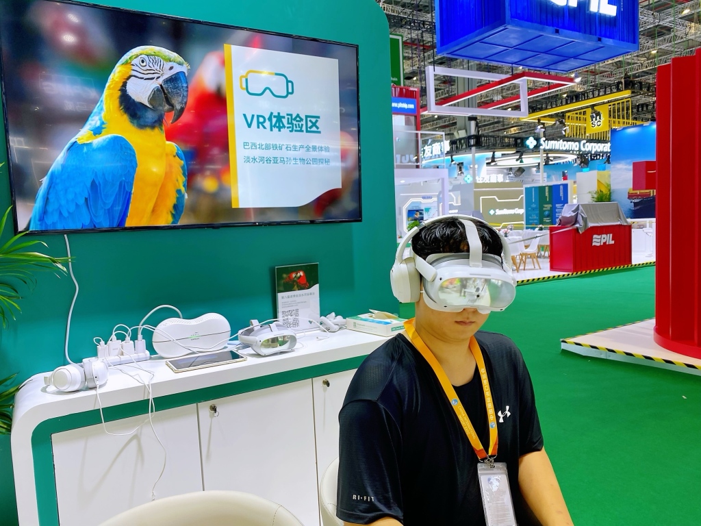 在淡水河谷展台,参观者通过VR设备“探访”亚马孙生物公园。