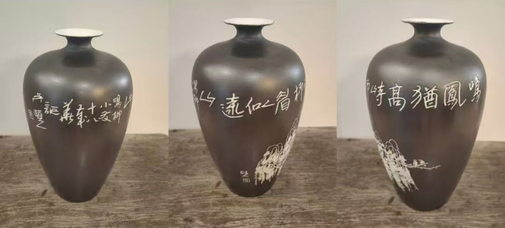 瓷艺方面,他在申窑时期将传统绘画与釉色窑变相结合,作品绚丽多变。更将秦诏版、岩画及纳西文字等元素绘刻于瓷上,赋予其深邃的文化意境。