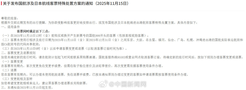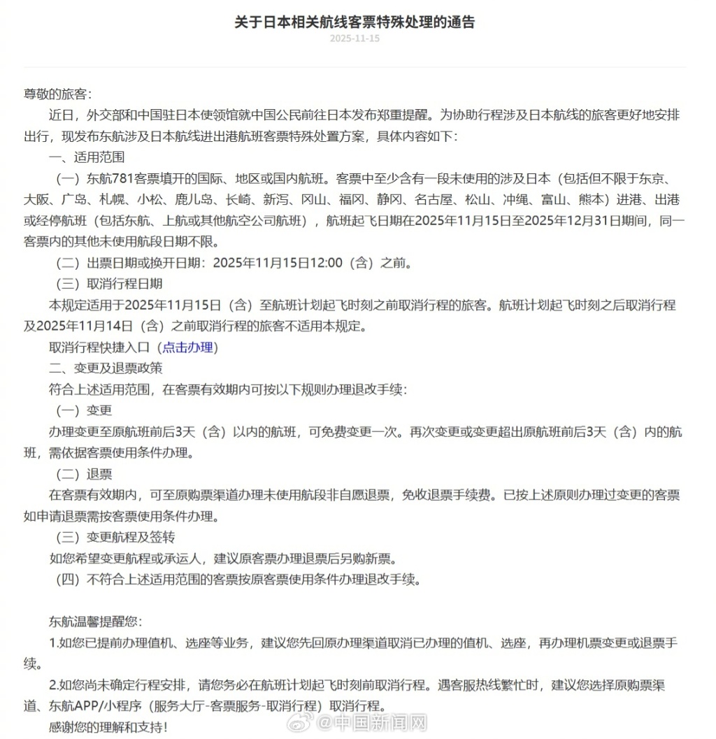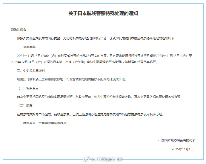 正文 三大航司发布日本航线客票处理通知:机票可免费退改 亿通速配 V管理员 /2025-11-15 16:00:03/3阅读/0评论 1115 文章最后更新时间2025年11月15日,若文章内容或图片失效,请留言反馈! 15日,中国南方航空股份有限公司发布《关于日本航线客票特殊处理的通知》,中国国际航空股份有限公司发布《关于发布国航涉及日本航线客票特殊处置方案的通知》,中国东方航空股份有限公司发布《关于日本相关航线客票特殊处理的通告》。