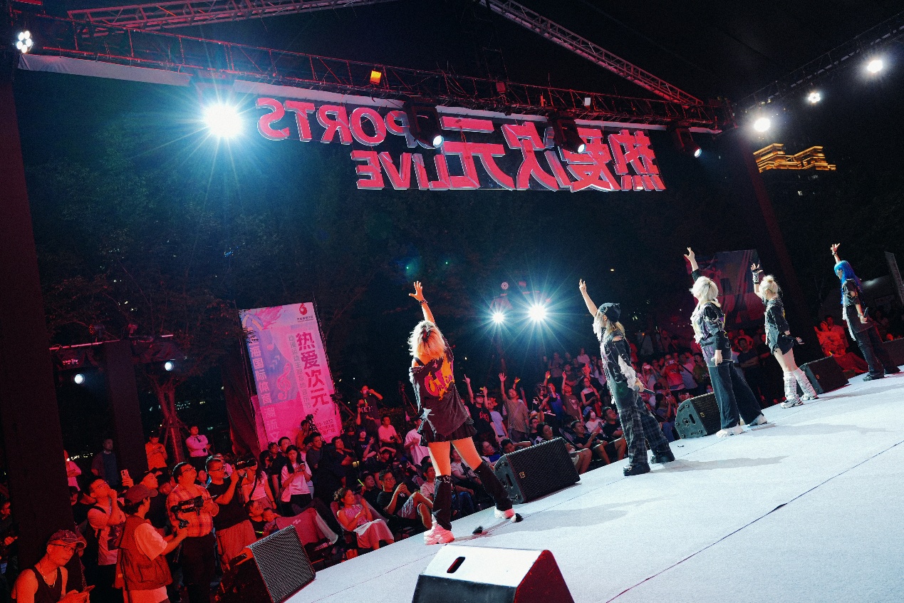 首日演出中,Whatever乐队率先登台,一连演绎多首经典运动动漫主题曲。当《灌篮高手》、《四驱兄弟》、《火影忍者》等金曲接连响起,迅速点燃现场氛围,台下观众随节奏挥动荧光棒,形成一片涌动的光海。表演区域的火热景象,成功吸引了诸多市民驻足观看,将场地层层围拢。