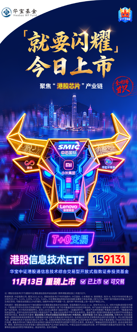 中国半导体行业上市公司最新披露的三季报业绩迎来强劲爆发。Wind数据显示,剔除尚未披露业绩的、,今年前三季度申万半导体行业上市公司营业收入合计达4392亿元,归母净利润合计达398亿元,同比上年可比口径分别增长近14%和约53%。10月28日公布的“十五五”规划建议全文强调,采取超常规措施,全链条推动集成电路、工业母机、高端仪器、基础软件、先进材料、生物制造等重点领域关键核心技术攻关取得决定性突破;明确推动量子科技、生物制造、氢能和核聚变能、脑机接口、具身智能、第六代移动通信等成为新的经济增长点;要求全面实施“人工智能+”行动,抢占人工智能产业应用制高点,全方位赋能千行百业。相关表述将中国芯片产业成长空间强力推升到了“决定性突破”的新高度。千亿规模ETF大厂——华宝基金旗下全市场首只聚焦“港股芯片”产业链的港股信息技术ETF(159131)今日(11月13日)澎湃上市,该基金为全市场首只跟踪中证港股通信息技术综合指数(简称“港股通信息C”)的ETF,其标的指数由属于信息技术产业的42只港股硬科技公司构成成份股组合,将为投资者参与把握港股“中国硬科技资产”投资机遇提供又一创新ETF工具。据2025年基金季报统计,2025年前三季度,华宝基金旗下所有ETF(含货币型)利润合计168.95亿元,其中股票ETF利润合计高达162.61亿元。