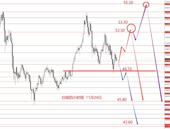 白银上周正如预期,先在49.40得以支撑反弹,后又在52.50承压回落,走完了分析图里的红线反弹和第一波下跌,48.70区域到位。从图形来看,白银的整体框架为高位震荡偏空头,本周建议继续高空为主,下方重点关注48.60强支撑,以上还是反弹的概率较大些,反弹高点继续关注52.50和53.30区域强阻力,若能到位再留意波段下跌行情。后市红线概率较大,紫线和蓝线都为备选方案,框架思路仅供参考,风险自负。