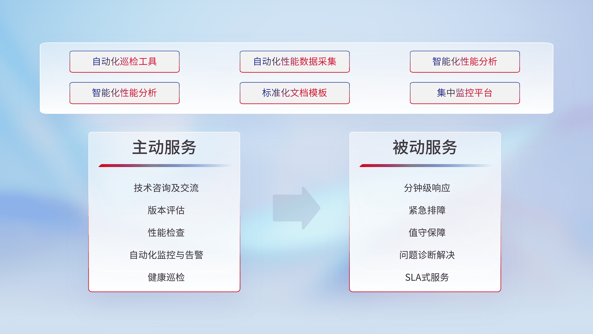 智能化工具和标准化文档,,,,保障服务质量,,提供主动服务(包含技术咨询、、、、版本评估、、、性能检查、、、自动化监控与告警、、、、健康巡检)和被动服务包含(分钟级响应、、紧急排障、、、值守保障、、、问题诊断解决、、、SLA服务)。。。。
